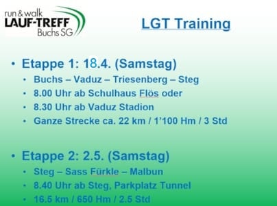 Alex bietet wieder Trainings an für den Gamperney-Berglauf (30. Mai) und den LGT-Marathon (13. Juni).